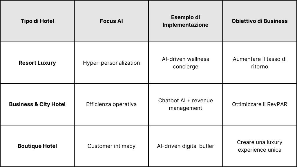 Non tutti gli hotel di lusso hanno le stesse necessità. Un boutique hotel high-end avrà priorità diverse rispetto a un grande brand come Hilton. La scelta della giusta soluzione AI dipende dal modello di business e dal target di clientela.