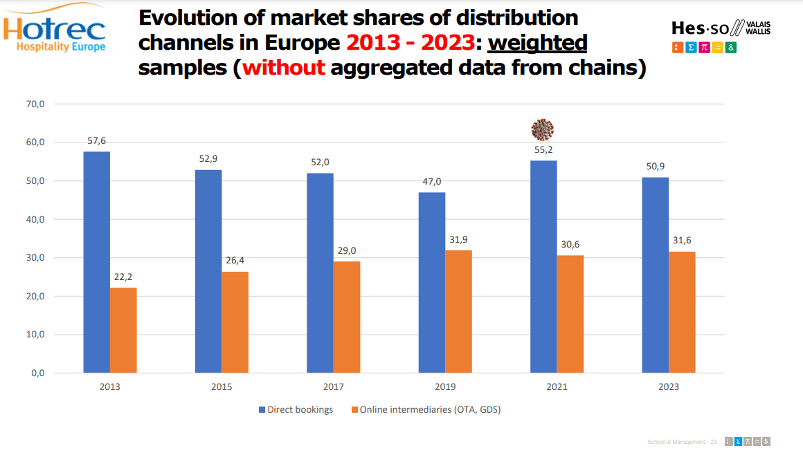 Il decennio 2013-2023 ha visto una crescente influenza delle OTA sul fatturato delle strutture alberghiere in Europa. Il trend evidenzia un aumento di 10 punti percentuali, passando dal 19,7% nel 2013 al 29,6% nel 2023 (Hotrec, 2024).