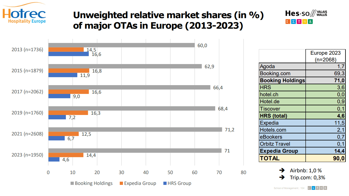 I tre principali attori restano Booking Holding, Expedia Group e, in misura minore, HRS, con una quota di mercato complessiva del 90%.