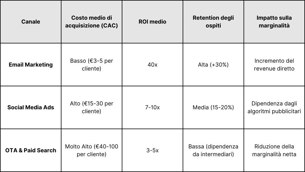 Gli hotel di lusso che si affidano esclusivamente alle OTA rischiano di perdere fino al 30% della marginalità netta a causa delle elevate commissioni sulle prenotazioni. L’email marketing si distingue non solo per il basso costo di acquisizione, ma anche per la capacità di creare relazioni dirette e fidelizzanti con gli ospiti, riducendo la dipendenza da intermediari e garantendo un maggiore controllo sui dati.