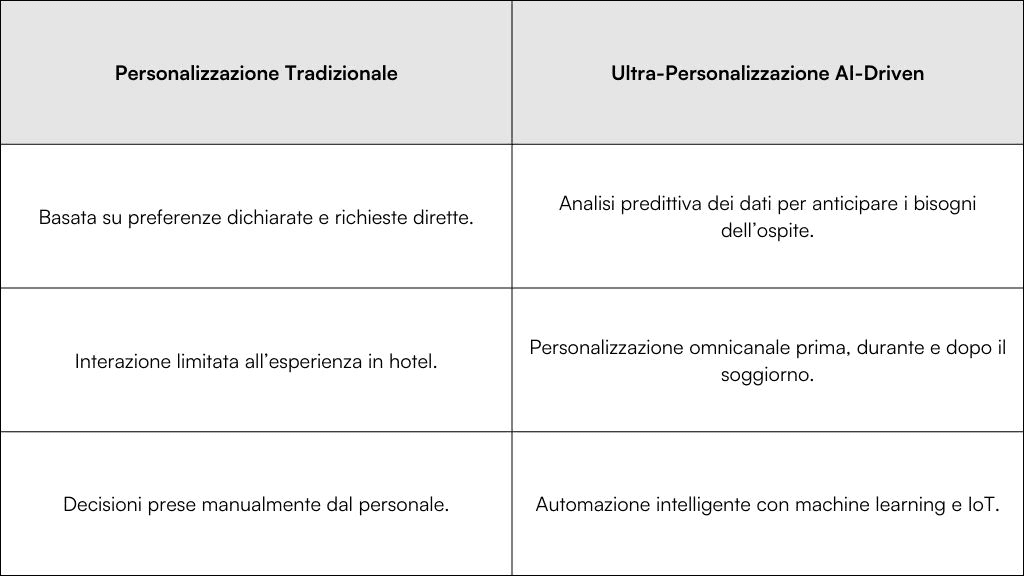 La differenza tra personalizzazione tradizionale e iper-personalizzazione basata sull’AI risiede nella capacità di anticipare le esigenze dell’ospite prima ancora che vengano espresse.